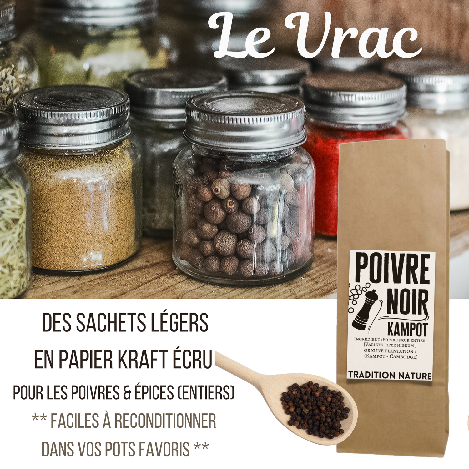 DécouvrirUne sélection d'épices Tradition Nature , en sachets écologiques en kraft écru made in France. En petits et grands conditionnements.